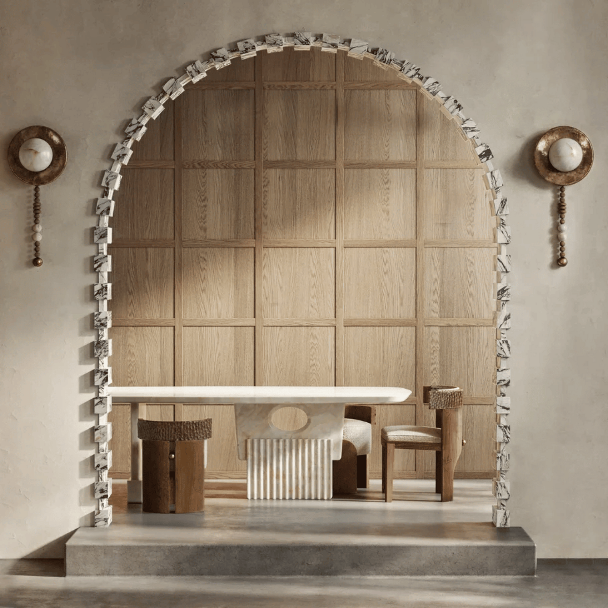 Elevate your interiors with the Aureum Wall Sconce, a stunning blend of marble, wood, and warm LED illumination. Designed with Art Deco inspiration and handcrafted details, this wall-mounted light is perfect for bedrooms, foyers, dining spaces, or hotel-style lobbies. Its soft, non-dazzling glow creates a refined ambiance while its sculptural form turns your wall into an artistic statement.