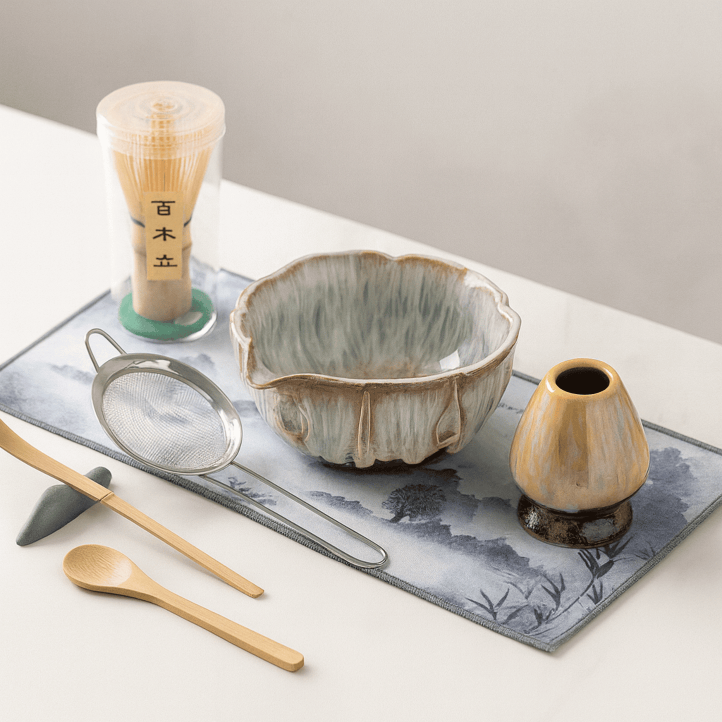 Set Includes: Matcha Whisk ×1, Tea Bowl ×1, Teaspoon ×1, Powder Sieves ×2, Tea Towel ×1, Teaspoon Rack ×1